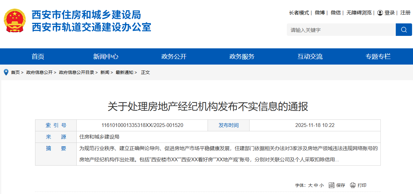 为规范行业秩序,建立正确舆论导向,促进我市房地产市场平稳健康发展,结合9月19日《西安市网信办通报一批房地产领域违法违规网络账号》认定的违规行为,住建部门依据《房地产经纪管理办法》《西安市房地产经纪信用信息管理办法》对涉及的3家房地产经纪机构作出处理,现将有关情况通报如下: