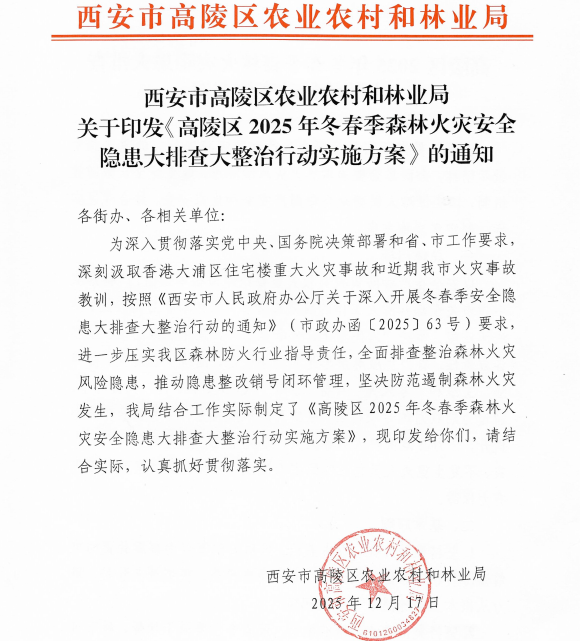 岁末年初,风干物燥,正是森林草原火情的高发期。高陵区深入贯彻落实《森林草原防灭火条例》,多措并举,织密防火安全网,用实际行动守护城市生态屏障,全力保障人民群众生命财产安全。