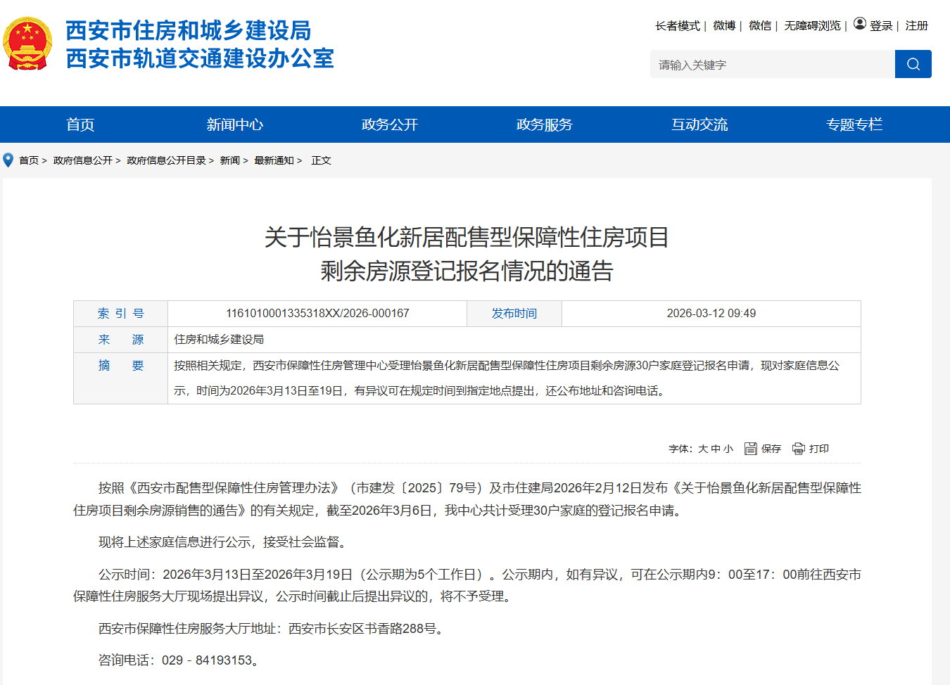 按照《西安市配售型保障性住房管理办法》(市建发〔2025〕79号)及市住建局2026年2月12日发布《关于怡景鱼化新居配售型保障性住房项目剩余房源销售的通告》的有关规定,截至2026年3月6日,我中心共计受理30户家庭的登记报名申请。