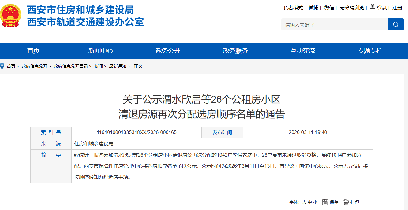 经统计,报名参加渭水欣居等26个公租房小区清退房源再次分配的轮候家庭共计1042户。按照《西安市公共租赁住房管理办法》的要求,经各区住房保障主管部门复审核查,其中28户复审未通过,取消资格,最终确定参加分配的轮候家庭共计1014户。