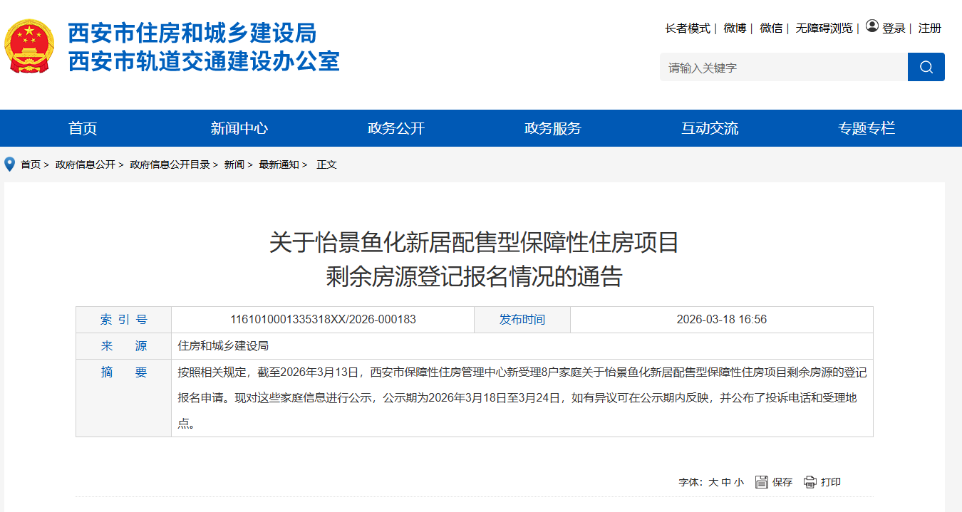 按照《西安市配售型保障性住房管理办法》(市建发〔2025〕79号)和《关于怡景鱼化新居配售型保障性住房项目剩余房源销售的通告》有关规定,截至2026年3月13日,我中心新受理8户家庭的登记报名申请。
