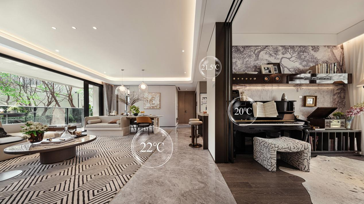 科技路金茂府通过地源热泵、毛细管网、24小时置换新风等12大系统,构建了“舒温、舒湿、舒氧、舒静、舒净”的五舒健康微气候。