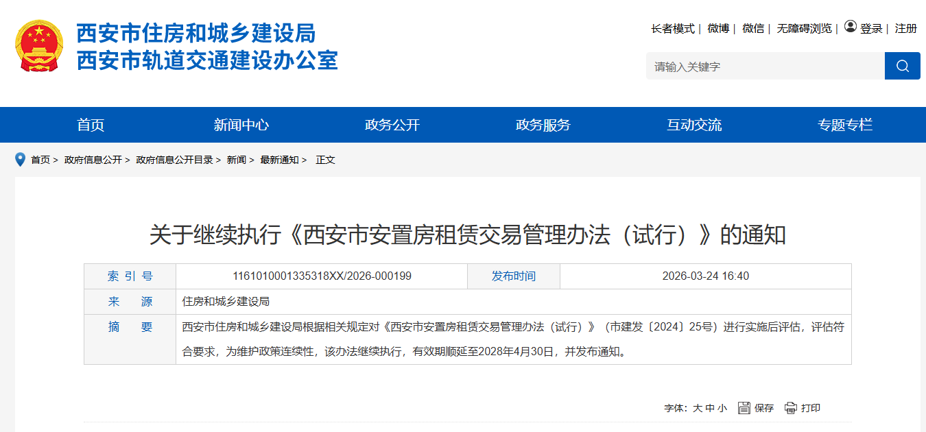 根据《西安市行政规范性文件管理办法》等相关规定,我局对《西安市安置房租赁交易管理办法(试行)》(市建发〔2024〕25号)进行了实施后评估。经评估,符合现行法律法规、政策规定及本市安置房租赁交易管理工作实际。为维护政策连续性,《西安市安置房租赁交易管理办法(试行)》(市建发〔2024〕25号)继续执行,有效期顺延至2028年4月30日。