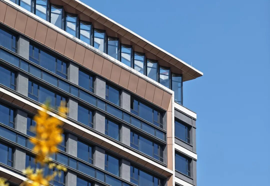首先,色调控制上极佳。灰白调打底,大面积仿珍珠蓝玻璃自带冷峻感!但是,香槟金铝板的加入,让整个建筑温暖柔和,更贴近于人。 再者,是标志性的挑檐冠顶造型。不对称的处理方式,打破了直线体块的僵硬。连续的折面玻璃,让建筑如同波浪般错落,呈现云一般蓬松感。 ②点亮生活场景优质的建筑空间表达,核心是为业主提供足够丰富且美好的生活场景。