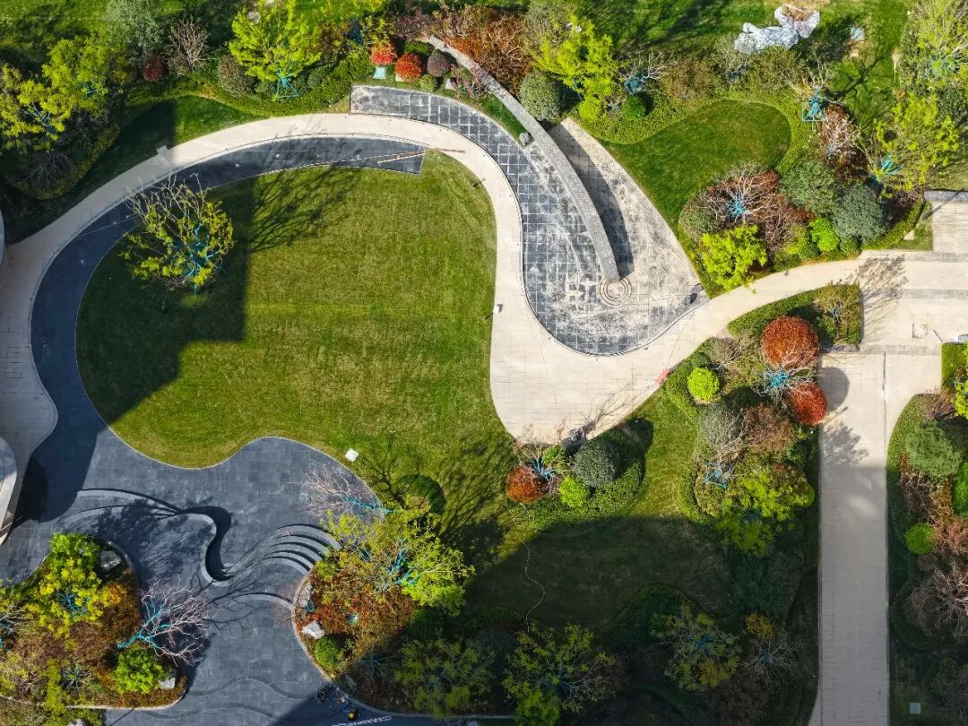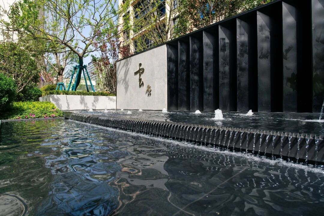 中庭以蜿蜒曲线构图,水的意象串联始终——时而汇成浮岛下的静水面,时而化作溪谷间的涓涓细流,时而又变为孩童戏耍的浅滩,不同景观场景与业主对话。